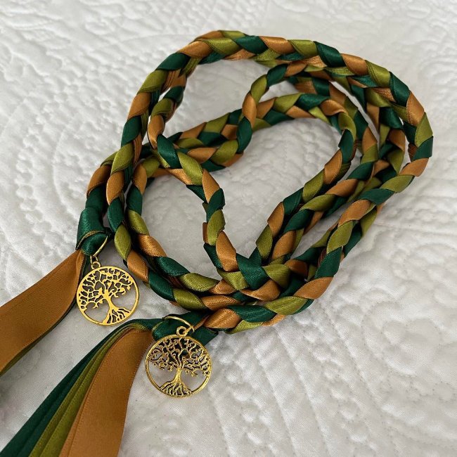 Historians believe “ tying the knot” originated in the Irish tradition of HandFasting where Couples acknowledged their betrothal by having their hands tied together by an officiant with ribbons or cord to symbolise their commitment to each other. Nowadays this ritual is very popular at weddings and vow renewal ceremonies. They can involve family and friends where each person places a different coloured ribbon over the couple’s hands each ribbon representing a different meaning.